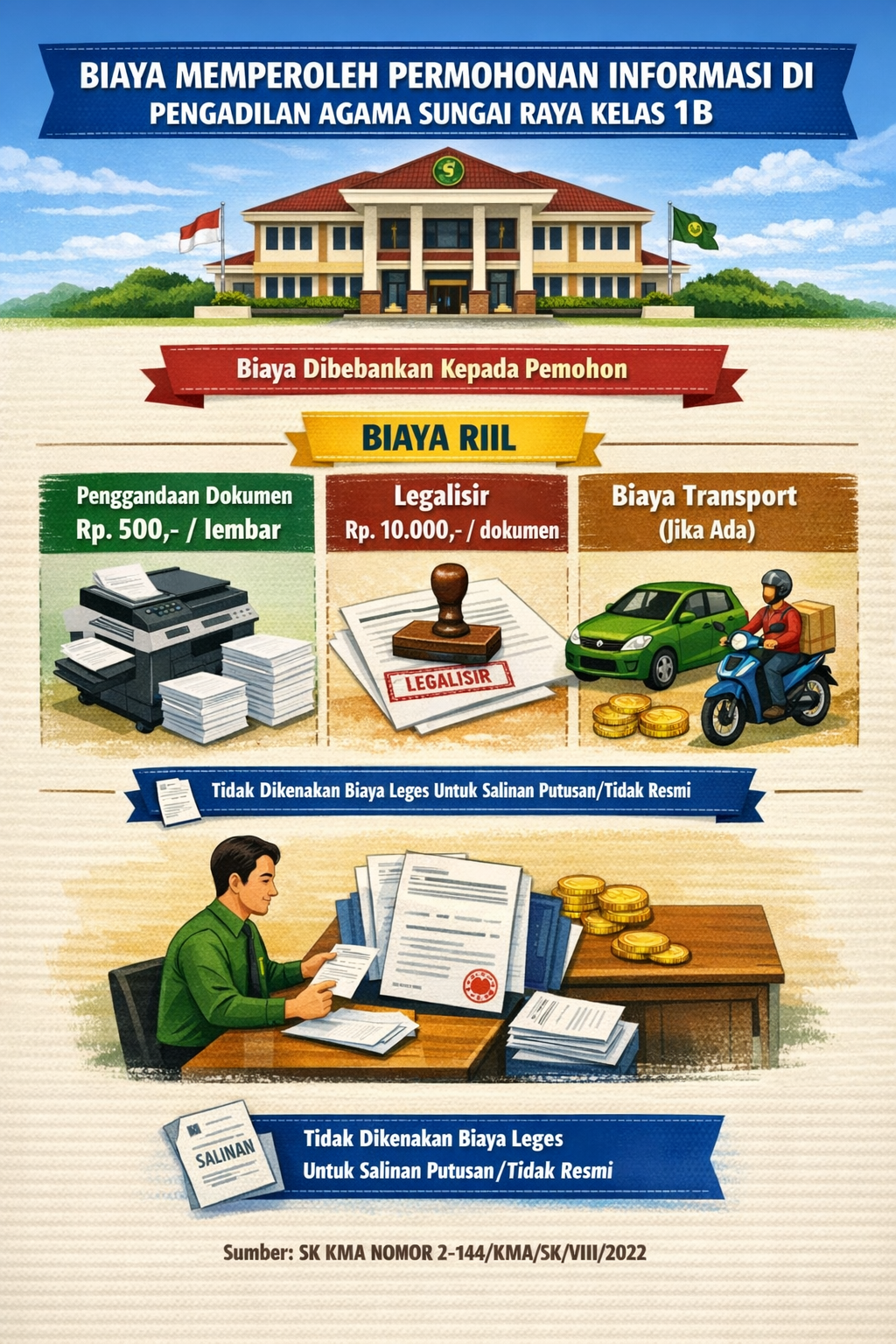 - Terhadap permohonan informasi mengenai penggandaan putusan atau penetapan tidak dikenakan biaya leges karena yang dapat diberikan kepada pemohon bukan merupakan salinan resmi.