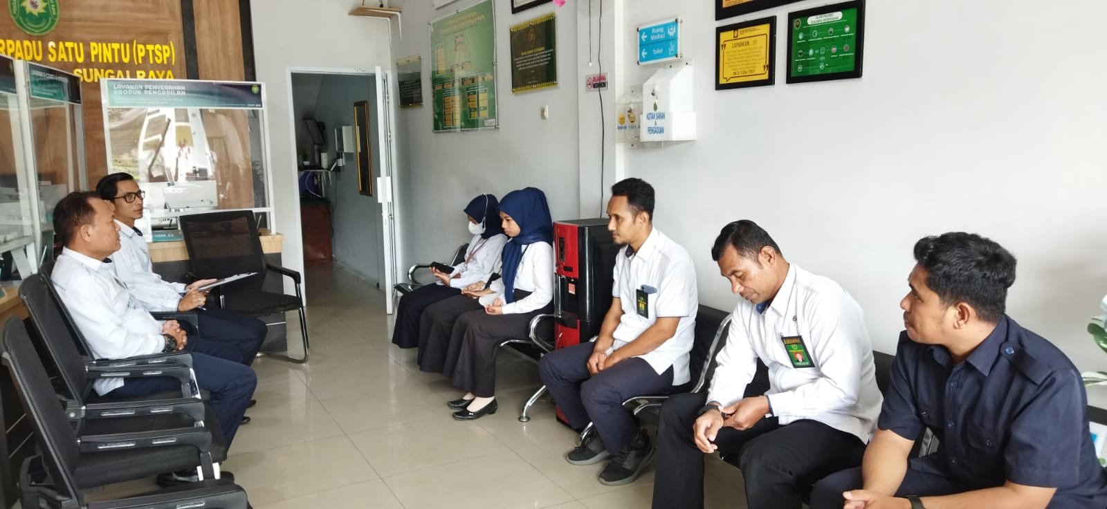 Selain Fauzy Nurlail, S.H., M.H., briefing kali ini juga didampingi oleh Panitera Muda Hukum Pengadilan Agama Sungai Raya, Hamdani, S.Ag., S.Pd. yang pada kesempatannya menyampaikan kepada Petugas PTSP untuk senantiasa memperhatikan penampilan selama jam pelayanan agar menimbulkan kesan yang baik bagi masyarakat. Briefing ditutup dengan himbauan dari Wakil Pengadilan Agama Sungai Raya, Dr. Massadi, S.Ag., M.H., untuk selalu menjaga kebersihan dan kerapian di lingkungan PTSP dengan tidak meletakkan makanan di atas meja dan dengan tidak meletakkan jaket di kursi. (Jasmine)