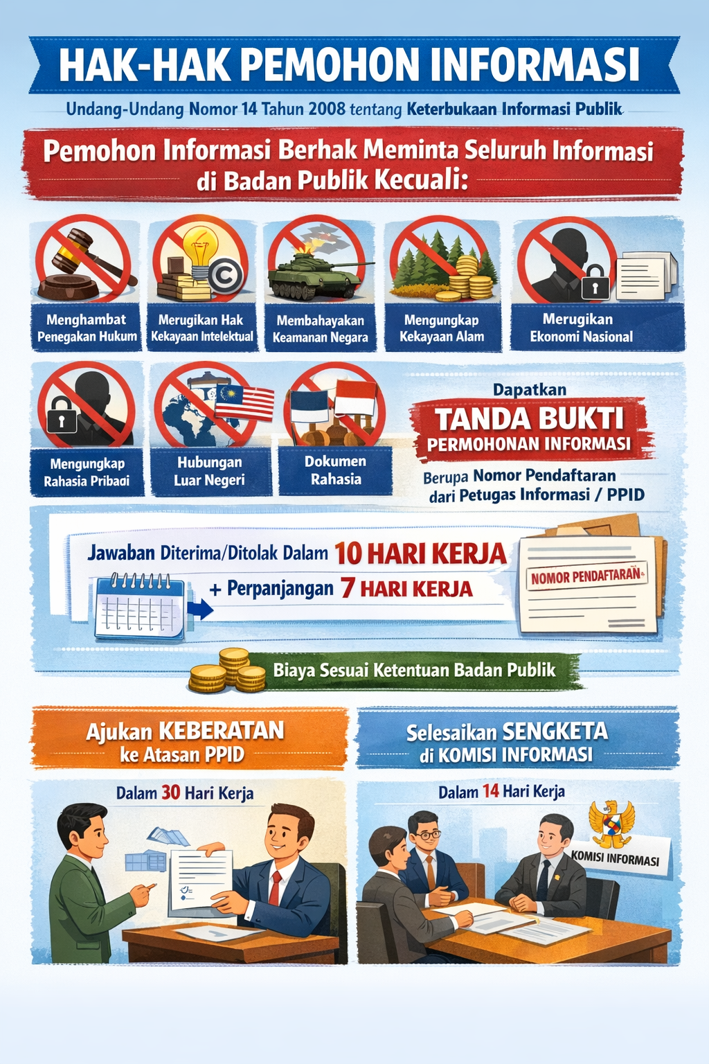 Mengungkap kekayaan alam Indonesia; Merugikan ketahanan ekonomi nasional; Merugikan kepentingan hubungan luar negeri; Mengungkap isi akta otentik yang bersifat pribadi dan kemauan terakhir ataupun wasiat seseorang; Mengungkap rahasia pribadi; Memorandum atau surat-surat antar Badan Publik atau intra Badan Publik yang menurut sifatnya dirahasiakan kecuali atas putusan Komisi Informasi atau Pengadilan; Informasi yang tidak boleh diungkapkan berdasarkan Undangundang. (b) Badan Publik juga dapat tidak memberikan informasi yang belum dikuasai atau didokumentasikan. - PASTIKAN ANDA MENDAPAT TANDA BUKTI PERMOHONAN INFORMASI BERUPA NOMOR PENDAFTARAN KE PETUGAS INFORMASI/PPID. Bila tanda bukti permohonan informasi tidak diberikan, tanyakan kepada petugas informasi alasannya, mungkin permintaan informasi anda kurang lengkap.