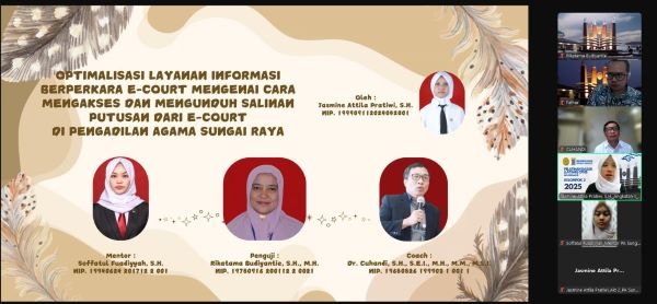 Dengan didampingi oleh Mentor atas nama Soffatul Fuadiyyah, S.H., Hakim pada Pengadilan Agama Sungai Raya, alhamdulillah pagi ini Jasmine Attila Pratiwi, S.H telah menyelesaikan seminarnya. Berkat bimbingan yang diperolehnya dari Bapak Cuhandi, S.H., S.E.I., M.H., M.M. selaku Pembimbing, alhamdulillah Jasmine Attila Pratiwi, S.H pagi ini sukses mempertahankan ide-idenya dalam ujian seminar proposal program di hadapan Penguji seorang Hakim Yustisia bernama Ibu Rikatama Budiyantie, S.H., M.H. Selama hampir 1 jam mempresentasikan ide yang ia tuangkan dalam sebuah inovasi poelayanan pada Pengadilan Agama Sungai Raya, terpantau Jasmine Attila Pratiwi, S.H menyuguhkan presentasinya dengan cukup baik dan tepat waktu.