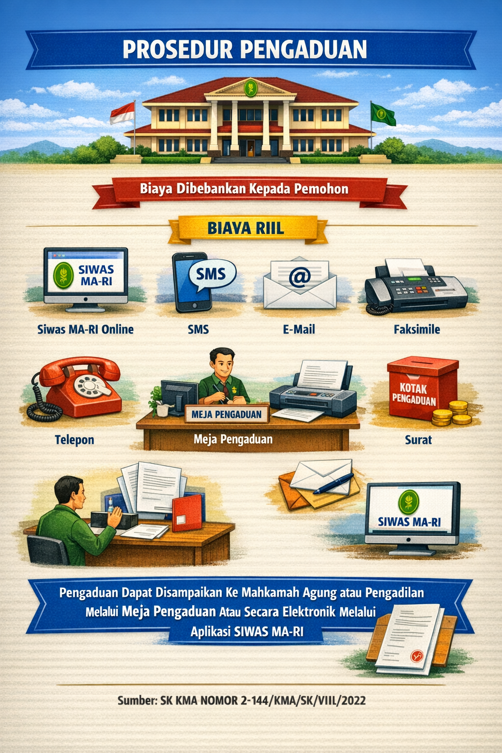 Pengaduan disampaikan kepada Mahkamah Agung, satuan kerja eselon I pada Mahkamah Agung, Pengadilan Tingkat Banding atau Pengadilan Tingkat Pertama secara lisan dan tertulis melalui Meja Pengaduan pada Mahkamah Agung,satuan kerja eselon I pada Mahkamah Agung, Pengadilan Tingkat Banding atau Pengadilan Tingkat Pertama dan/atau secara elektronik melalui aplikasi SIWAS MA-RI.