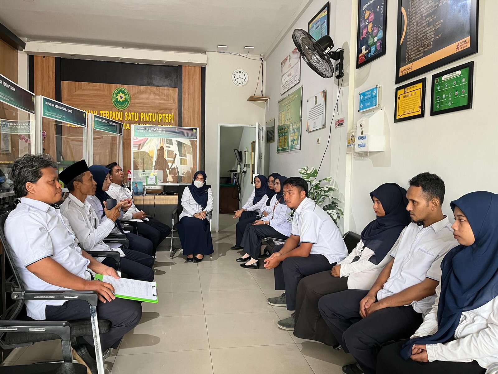 Selain itu, Ketua PA juga mengingatkan petugas untuk selalu bersikap sabar, mematuhi Standar Operasional Prosedur (SOP), serta menerapkan prinsip 5S (Senyum, Salam, Sapa, Sopan, Santun) dan 5R (Ringkas, Rapi, Resik, Rawat, Rajin) dalam bekerja. Beliau juga menginstruksikan agar buku-buku informasi mudah diakses oleh masyarakat, dan meminta petugas untuk segera berkoordinasi dengan Bapak Ilyas atau Ibu Marlisa jika menghadapi kendala.