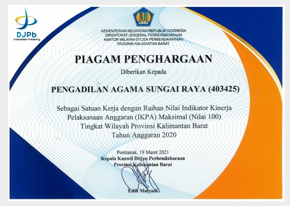Sebelumnya masih di tahun anggaran 2020, Pengadilan Agama Sungai Raya telah terlebih dahulu mendapatkan 2 penghargaan sebagai terbaik III yakni Pengelolaan Rekening Pemerintah dan Kualitas LPJ Bendahara. (RK)