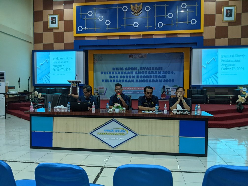 “Kami ucapkan terima kasih kepada para stakeholder di lingkup KPPN Pontianak karena Pelaksanaan Anggaran selama Tahun Anggaran 2024 lebih baik dari tahun sebelumnya. Dan kami berkomitmen untuk memberikan apresiasi kepada para Kuasa Pengguna Anggaran (KPA) yang satkernya berprestasi pada bulan Maret atau April 2025”, kata Eko Erifianto (Kepala KPPN Pontianak) saat memberikan sambutan dalam kegiatan Rilis APBN, Evaluasi Pelaksanaan Anggaran 2024 dan Koordinasi Pelaksanaan Anggaran 2025 yang dilaksanakan pada hari Rabu, 15 Januari 2025 di Aula Kanwil DjPB Provinsi Kalimantan Barat.